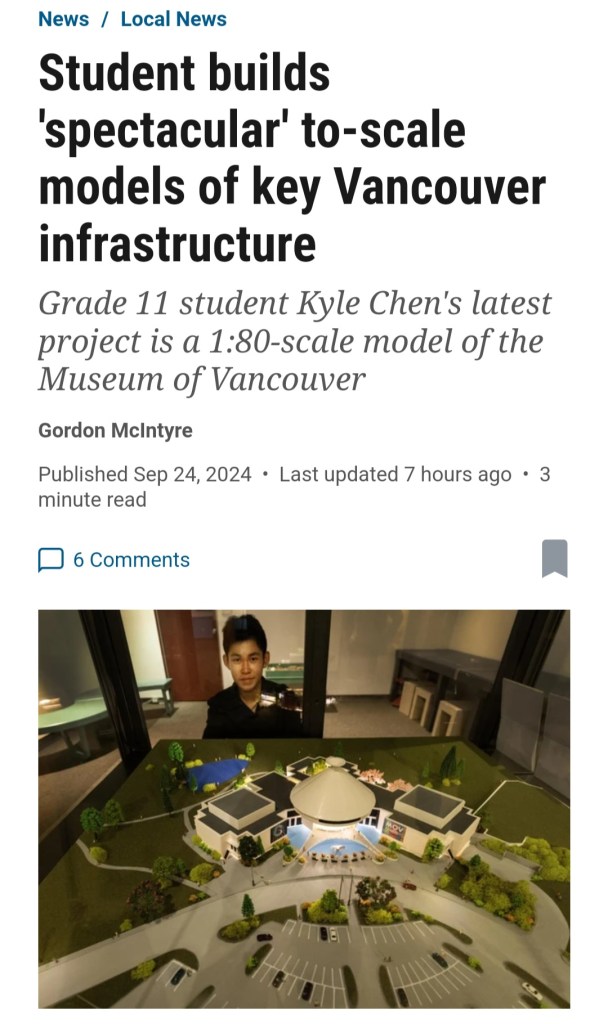 The Vancouver Sun’s article on Kyle Chen’s MOV model highlights his impressive architectural vision and craftsmanship. It commends his ability to create a detailed and thoughtful representation of the Museum of Vancouver, showcasing his deep understanding of design principles. The article recognizes Kyle as a rising talent in Vancouver’s creative community.
