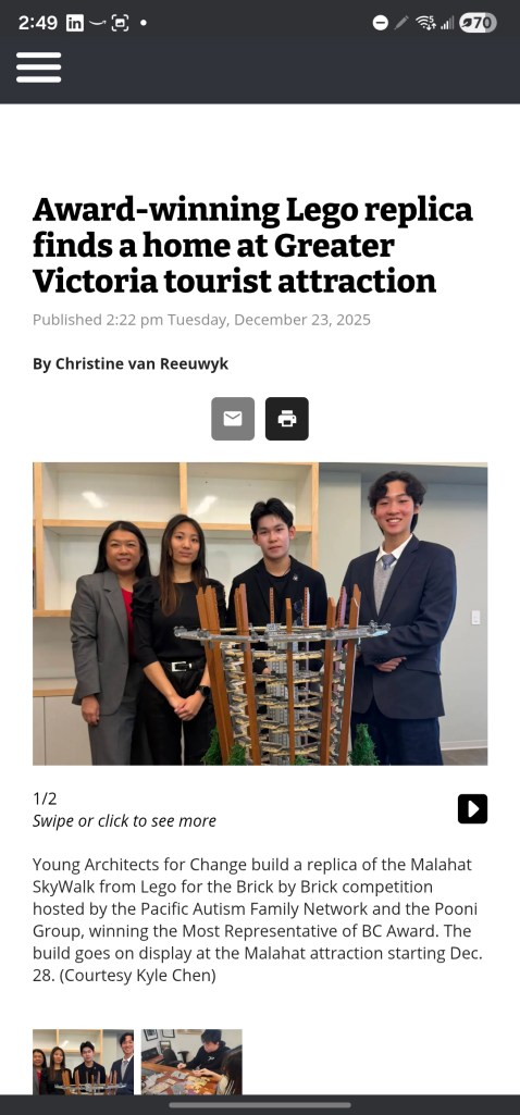 Young Architects for Change was featured in Victoria News for creating a detailed Lego model of the Malahat SkyWalk as part of a charity design competition. The project was built for the Brick by Brick event, which challenges teams to recreate iconic B.C. landmarks using Lego. YAC chose the Malahat SkyWalk because of its strong connection to nature and its distinctive spiral tower and elevated forest walkway. Our model carefully captured the curved boardwalk, lookout tower, and overall experience of the site. The build earned an award for best representing British Columbia. Following the competition, the model was set to be displayed at the Malahat SkyWalk for visitors to see.