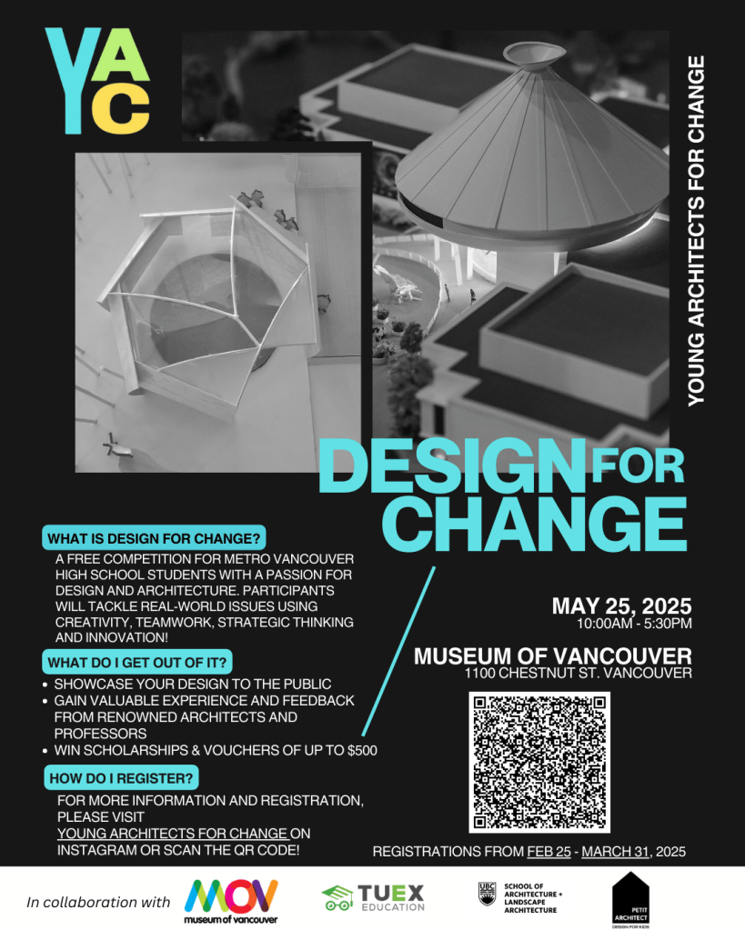 With Design for Change 2025, we partnered with the Museum of Vancouver to host this community competition. Alongside with our judge panel from UBC SALA, Petit Architects, About Here Videos, HEIA Studios, VCC, and Langara, Design for Change 2025 had over 50 high school students participating in the competition.